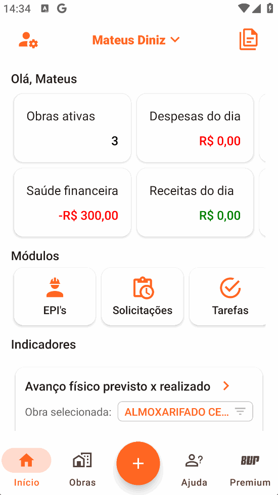 Ao lado da seção Obras, você verá um botão laranja com o símbolo “+”. Use esse botão para: