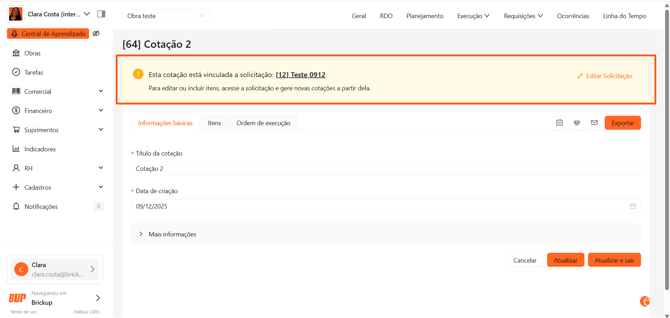 Para editar ou excluir uma Cotação, é necessário que a obra exista na plataforma — o que ocorre quando: