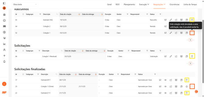 Para cotações originadas de Solicitações, a exclusão permanece bloqueada (indicadas em laranja no print anexado).