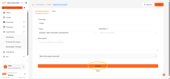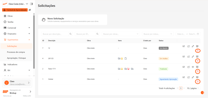 - Ao excluir uma solicitação, todos os itens relacionados (cotações, ordens de execução e lançamentos financeiros gerados a partir dela) serão excluídos permanentemente. Faça uma análise cuidadosa do impacto dessa ação na saúde financeira e logística da obra antes de prosseguir.
