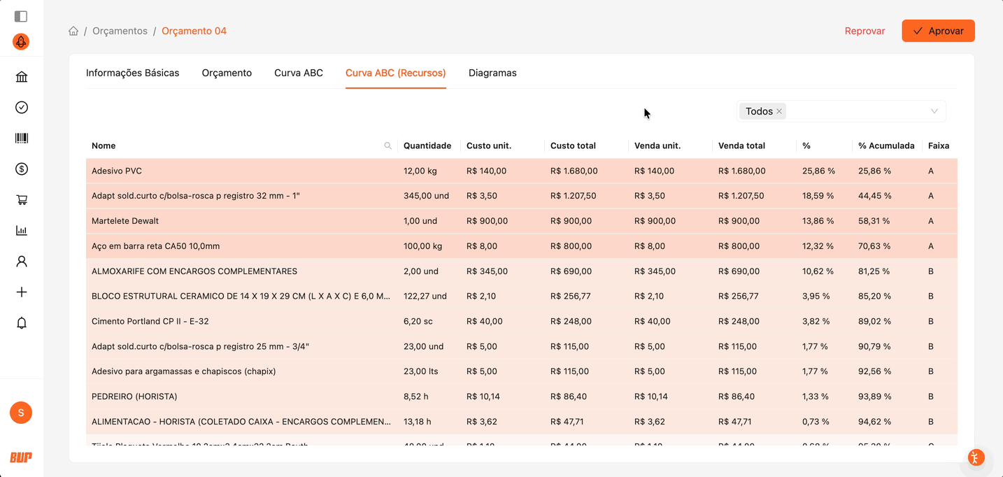 A Curva ABC classifica as etapas do orçamento conforme sua representatividade financeira:
