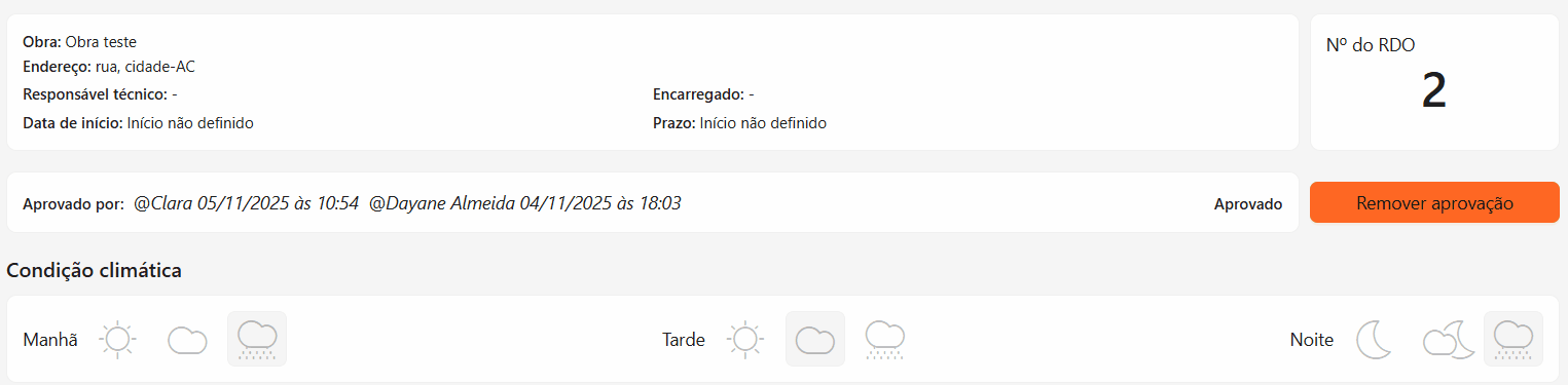 Ao abrir o RDO selecionado, clique em Remover aprovação (ícone disponível no canto superior direito da tela).