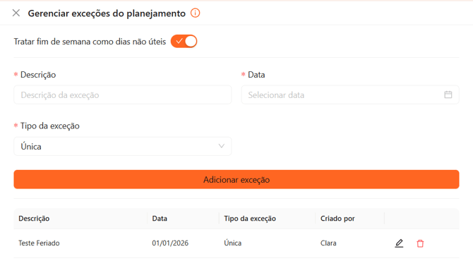 Durante o planejamento da obra, pode ser necessário indicar dias específicos em que não haverá trabalho — como feriados, recessos ou paralisações. Para isso, a Brickup oferece a funcionalidade Exceções, que permite registrar esses dias diretamente no cronograma da obra.
