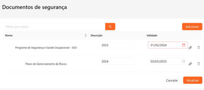 Alguns documentos exigem renovação periódica — como certificados de treinamentos, planos de riscos, documentos de SST/SSO e normas regulamentadoras.