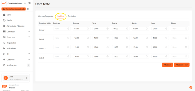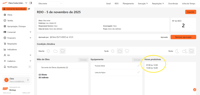 As alterações realizadas nesta seção afetam diretamente o RDO, pois definem o horário padrão da obra, refletido nas Horas Produtivas do dia.
