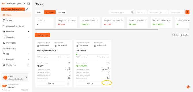 A obra precisa existir na plataforma — isto acontece quando um orçamento é aprovado e transformado em obra ou quando a obra é criada manualmente. Depois disso, é possível editar seus dados pelo painel.