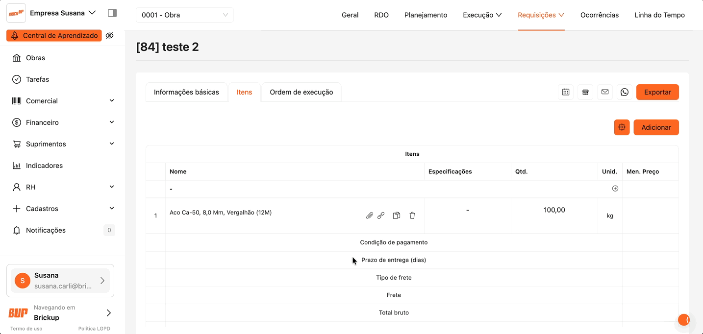 Na barra superior da obra, acesse Requisição → Cotações.