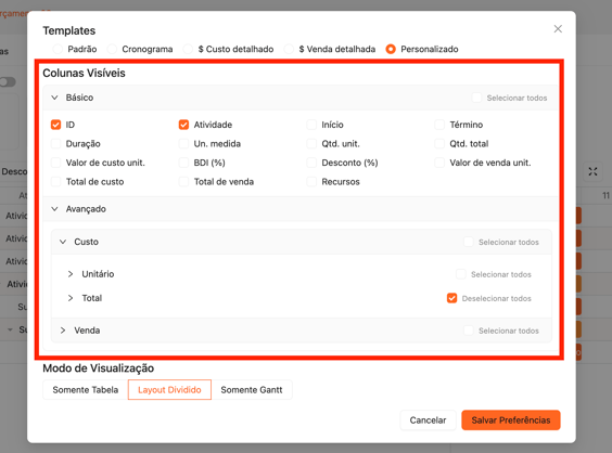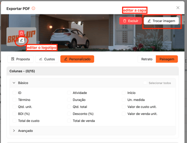 Essas opções estão disponíveis nas abas Básico e Avançado, permitindo ajustar o nível de detalhe de acordo com o público-alvo da proposta.