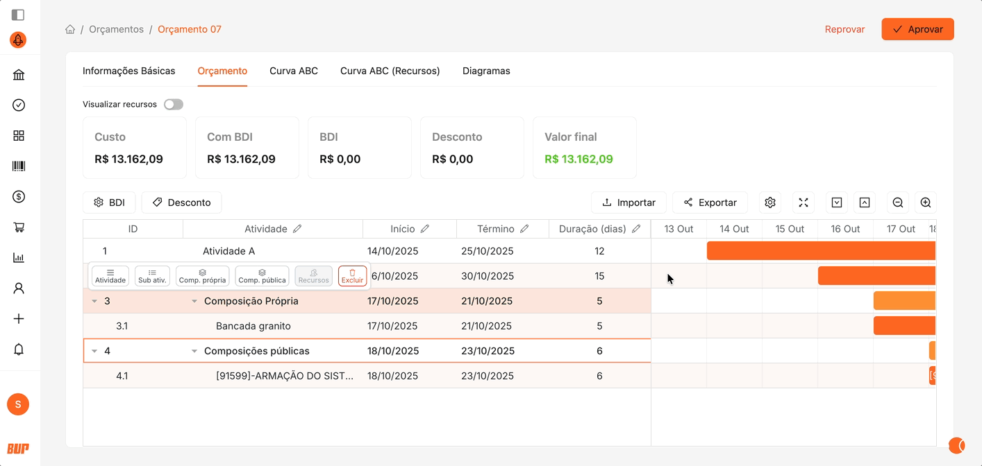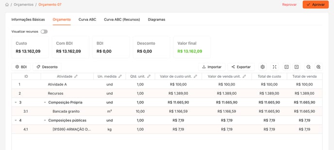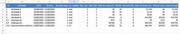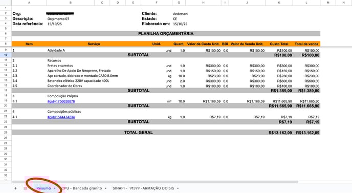 Na aba principal do documento, você encontrará o Resumo do Orçamento. As atividades são exibidas em estrutura hierárquica, somando automaticamente os custos dos itens associados.