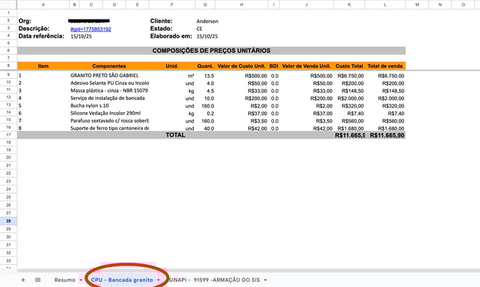 Ao clicar no link referente à Composição Própria na aba Resumo (no exemplo, aparece como o nome da composição CPU - Bancada granito