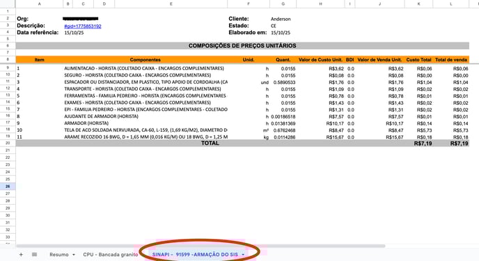 Funciona de forma análoga à Composição Própria. O nome da aba (ex.: SINAPI - 91599 - ARMAÇÃO DO SIS