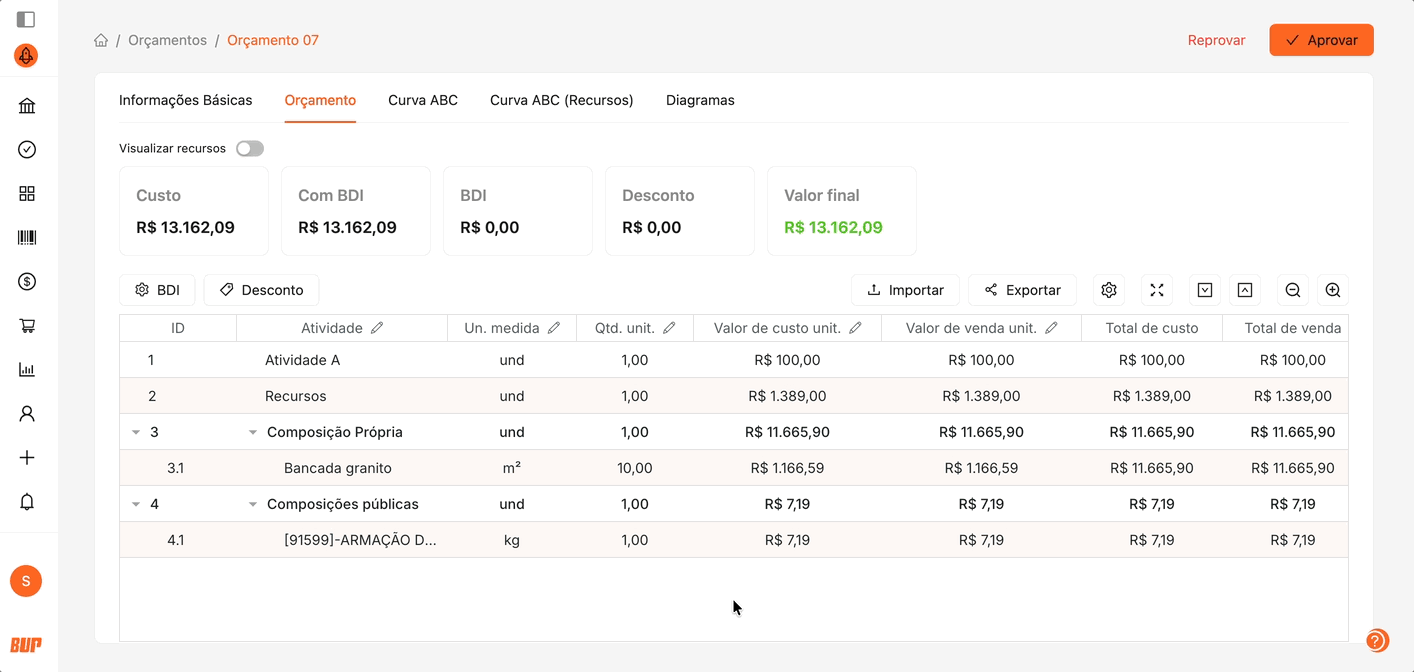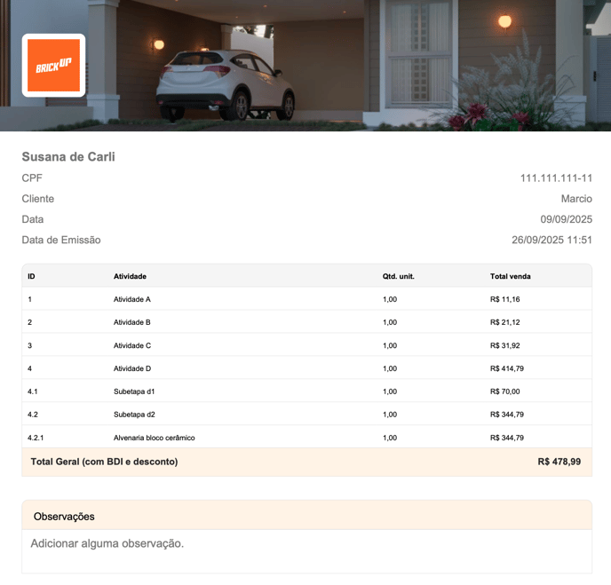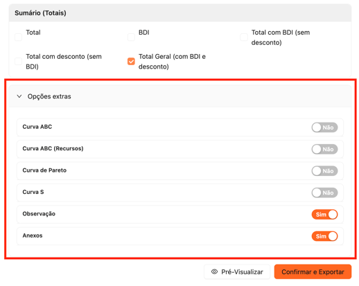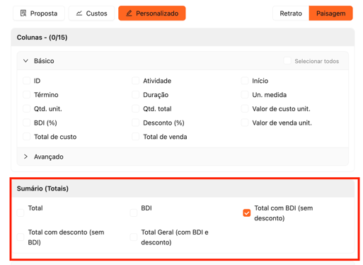 Na seção Sumário (Totais), você pode incluir os totais gerais do orçamento — com ou sem aplicação de BDI e descontos — garantindo flexibilidade na apresentação dos números ao cliente ou à equipe interna.