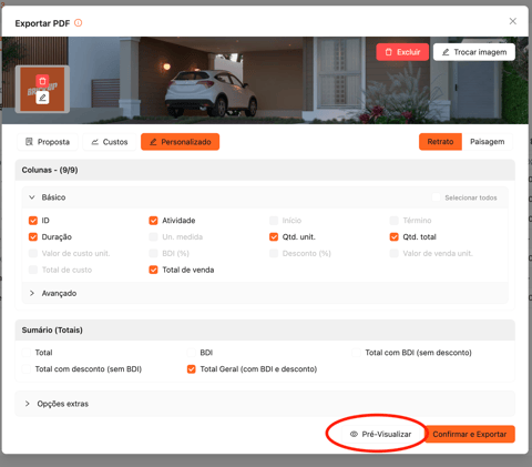 Antes de gerar o arquivo final, utilize a função Pré-Visualizar para revisar o layout e garantir que o PDF será exportado conforme o esperado.
