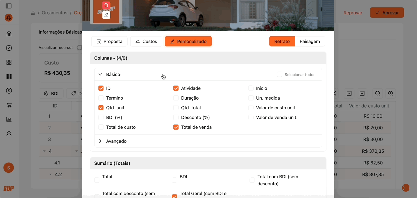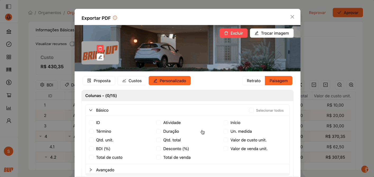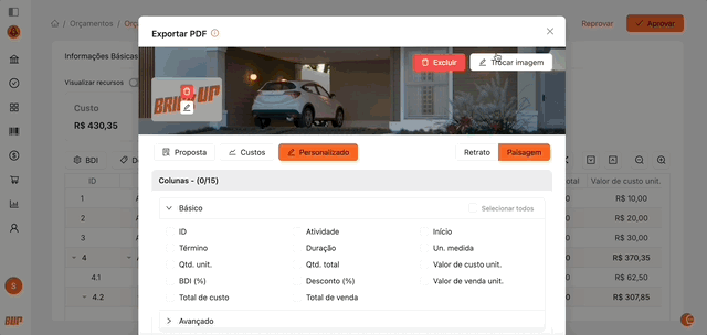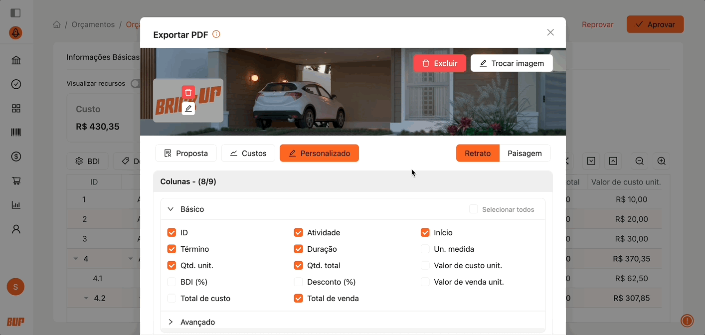 O PDF Customizado permite exportar o orçamento com opções avançadas de personalização, adequando o formato e as informações conforme a necessidade de apresentação.