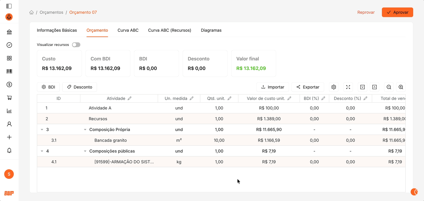 Quantidades, unidades de medida, custo unitário, BDI e valores de venda