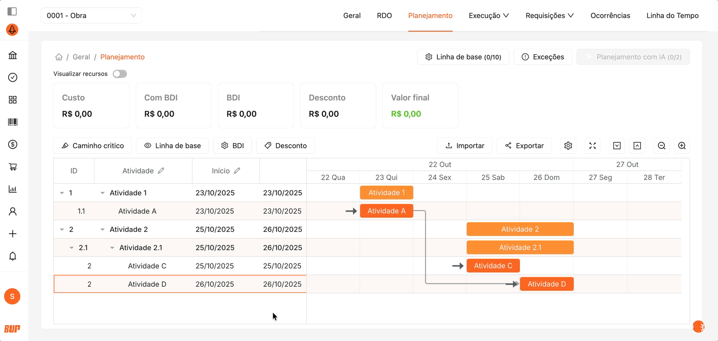 O Caminho Crítico é composto pelas etapas que impactam diretamente o prazo final da obra. Qualquer atraso nessas tarefas resultará no adiamento da conclusão do projeto.