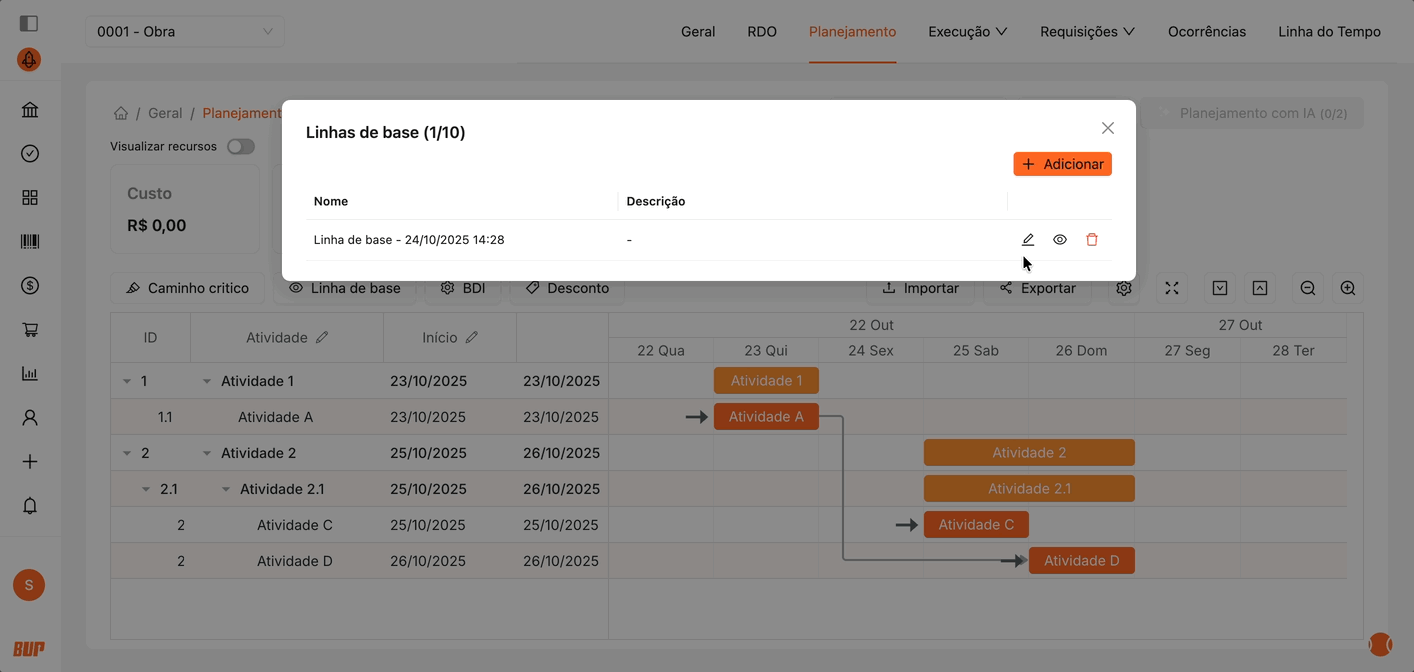 Clique no ícone de olho referente à linha de base desejada. Uma nova tela será aberta, permitindo comparar visualmente a linha de base com o planejamento atual.