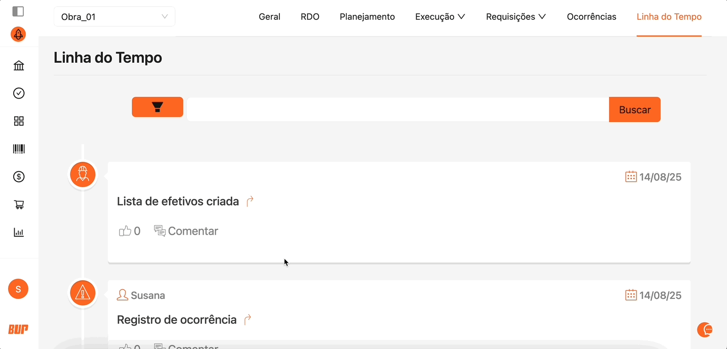 Acompanhe os principais eventos e interações do projeto em um único ambiente, permitindo o acompanhamento estruturado.