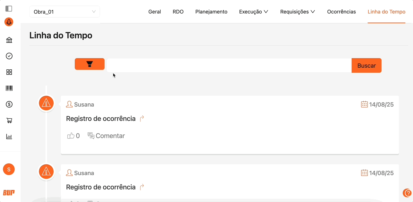 Exibe todos os eventos vinculados à obra em ordem cronológica, facilitando o acompanhamento da evolução do projeto.