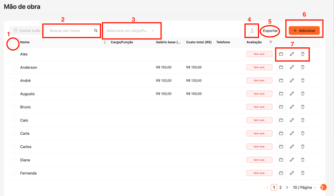 • Excluir (ícone da lixeira): remove o colaborador da base de mão de obra.