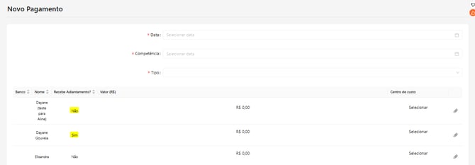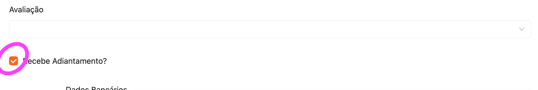 • Recebe Adiantamento?: Ao marcar a caixinha, o colaborador ficará apto a receber adiantamentos no módulo RH → Pagamentos.