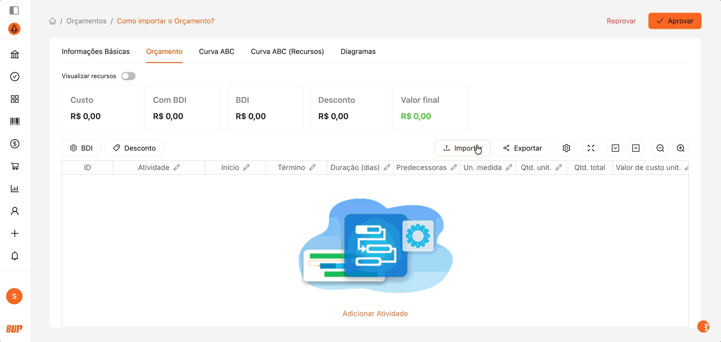 Após revisar, clique em Importar, aguarde o processamento e o orçamento será gerado automaticamente no sistema.
