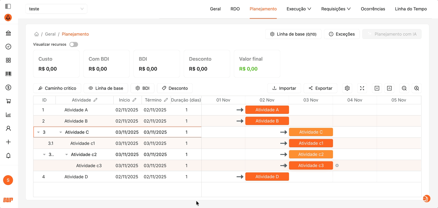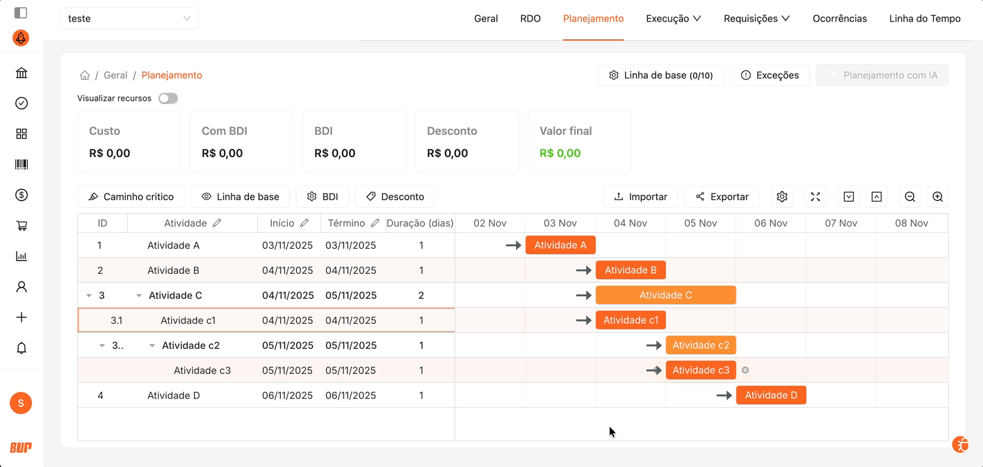 Somente as atividades posicionadas no nível mais baixo da hierarquia — ou seja, as atividades filhas — podem ter sua duração modificada. Qualquer alteração feita nelas é automaticamente refletida nas atividades mãe, ajustando a duração total das etapas superiores.