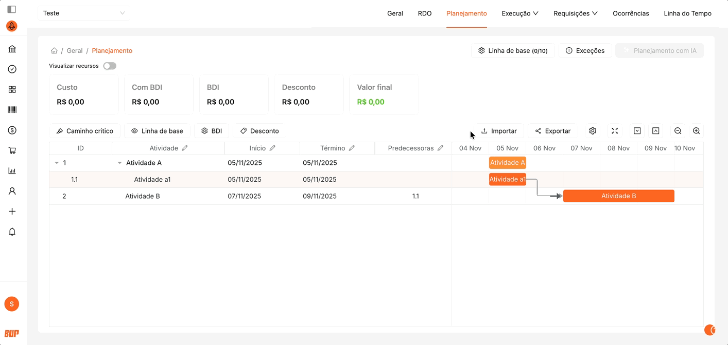Ao mover uma etapa superior (atividade mãe), todas as suas subetapas (atividades filhas) terão as datas de início e término ajustadas automaticamente, acompanhando o novo posicionamento no cronograma.