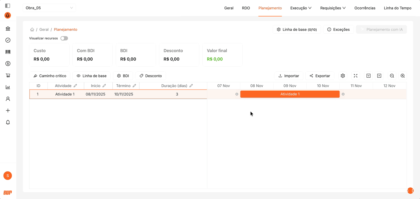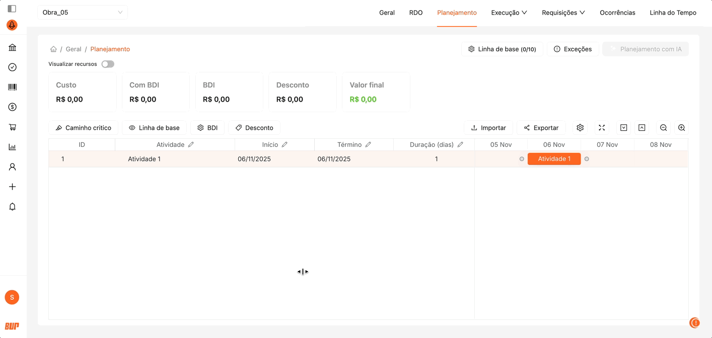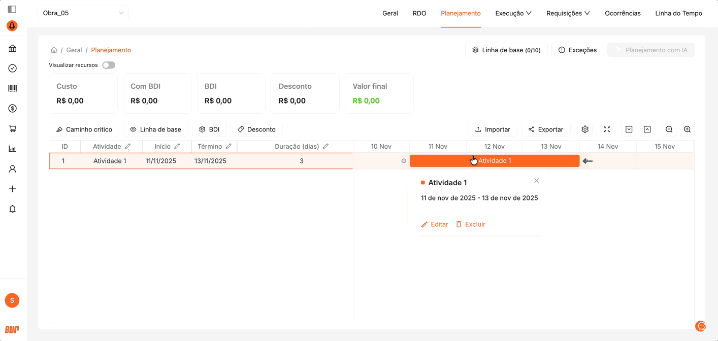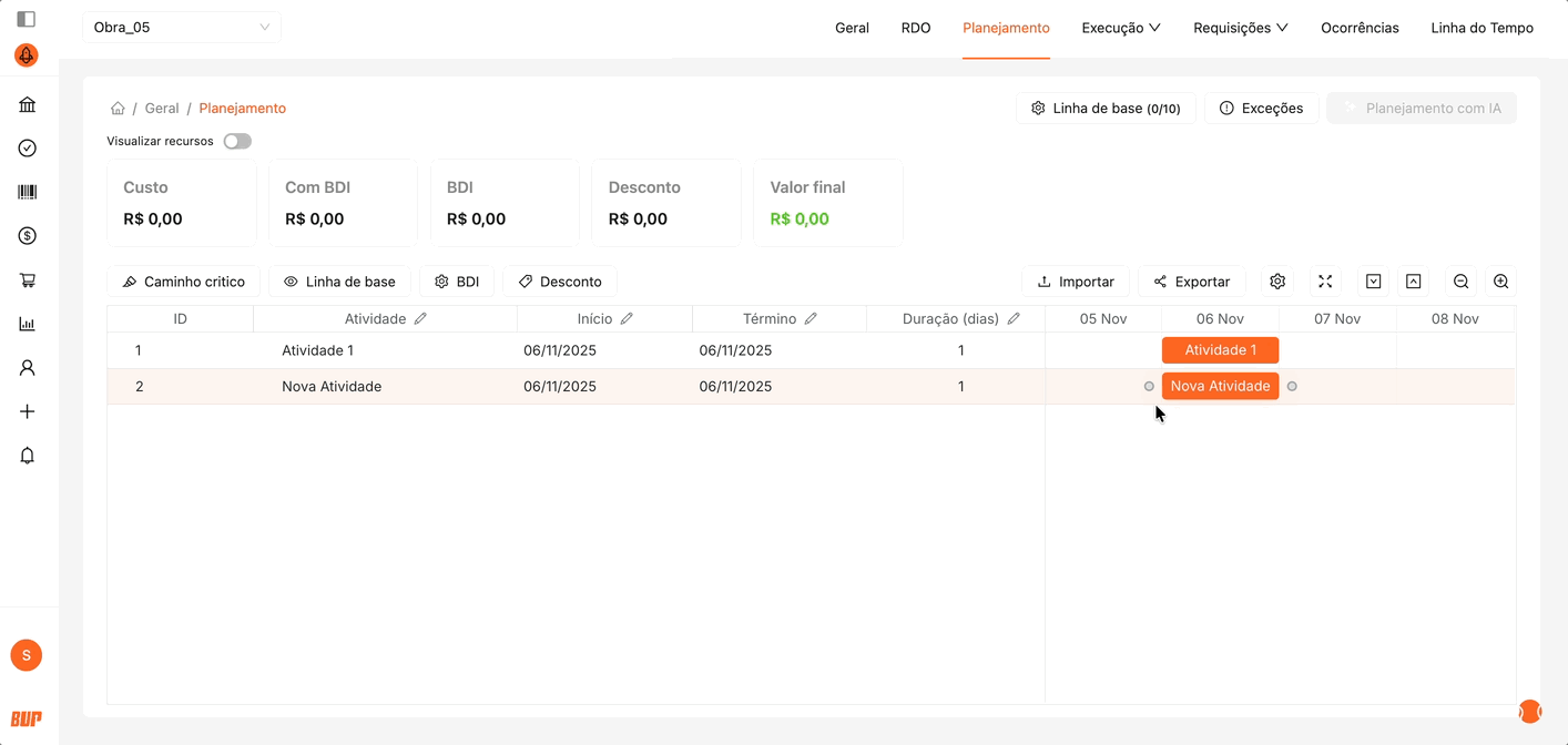 Mover atividades: Arraste a barra da atividade para ajustar suas datas de início e término conforme o avanço ou replanejamento da obra.