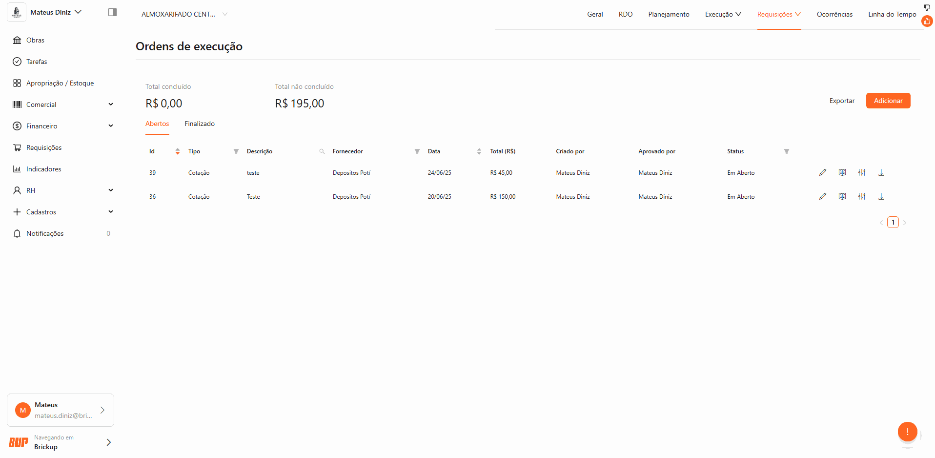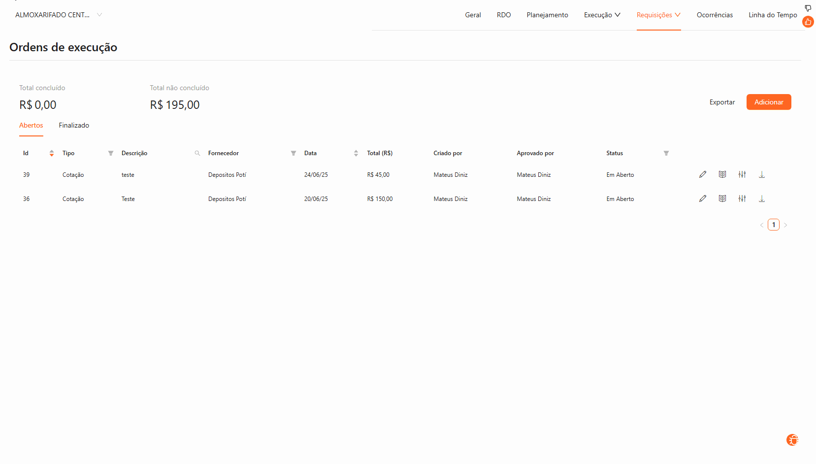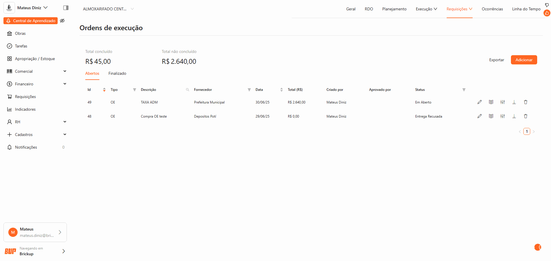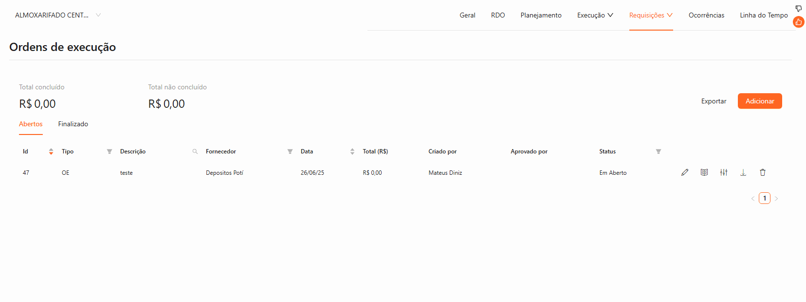 Você pode visualizar as Ordens de Execução acessando: Obra → Requisições → Ordens de Execução.