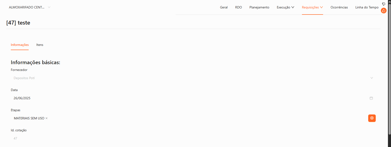 Além disso, na aba Itens, você pode consultar todos os produtos e serviços solicitados na cotação, com suas respectivas quantidades e valores unitários. Os itens da OE não podem ser editados. Isso ocorre porque a Ordem de Execução, ao ser gerada a partir de uma cotação aprovada, segue uma integração estruturada no sistema. Qualquer alteração comprometeria a integridade e rastreabilidade do fluxo de compras.