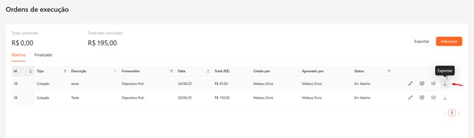 A Ordem de Execução será finalizada e ficará disponível na aba Finalizado, aguardando o lançamento financeiro. Em que, a despesa poderá ser criada posteriormente por meio do botão