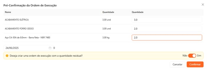 Se, no momento da confirmação, as quantidades entregues forem menores do que as solicitadas ao fornecedor, o sistema oferece a opção de gerar automaticamente uma Ordem de Execução Residual.