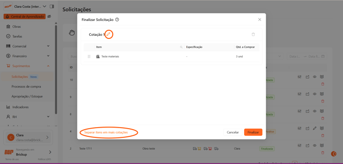 Se necessário, a solicitação pode ser dividida em mais de uma cotação.