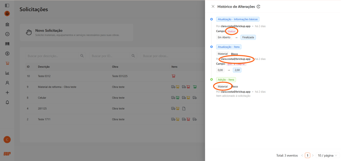 de Log todos os eventos da solicitação (usuário, data, item e alterações realizadas).