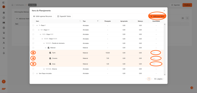 o sistema também permite acessar os materiais planejados por etapa, facilitando a conferência e o preenchimento da solicitação.