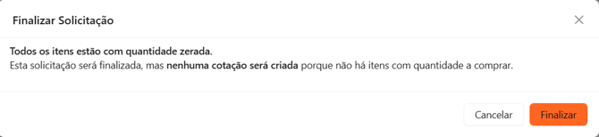 Se a solicitação for finalizada sem itens a comprar, nenhuma cotação será gerada. O sistema exibirá uma mensagem de alerta.